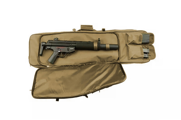 Secure padding and Velcro straps inside this nylon gear bag protects your guns, and a shoulder-strap system makes carrying them a breeze, freeing up your hands for other tasks. A tuck-away extendable sleeve allows you to expand the bag to accomodate a rifle up to 42 inches (1066mm) in length. A front storage pocket is large enough to fit an SMG, and hold it securely with Velcro straps.